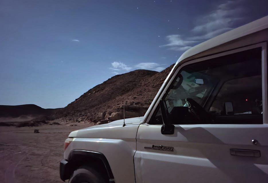 Experience the magic of the Egyptian desert on a stargazing adventure from Hurghada, with convenient hotel pickup and drop-off included. Begin with a jeep ride through the desert to watch a breathtaking sunset, then enjoy a camel ride with Bedouin tea, a traditional BBQ dinner, and an unforgettable stargazing session guided by an astronomer.
